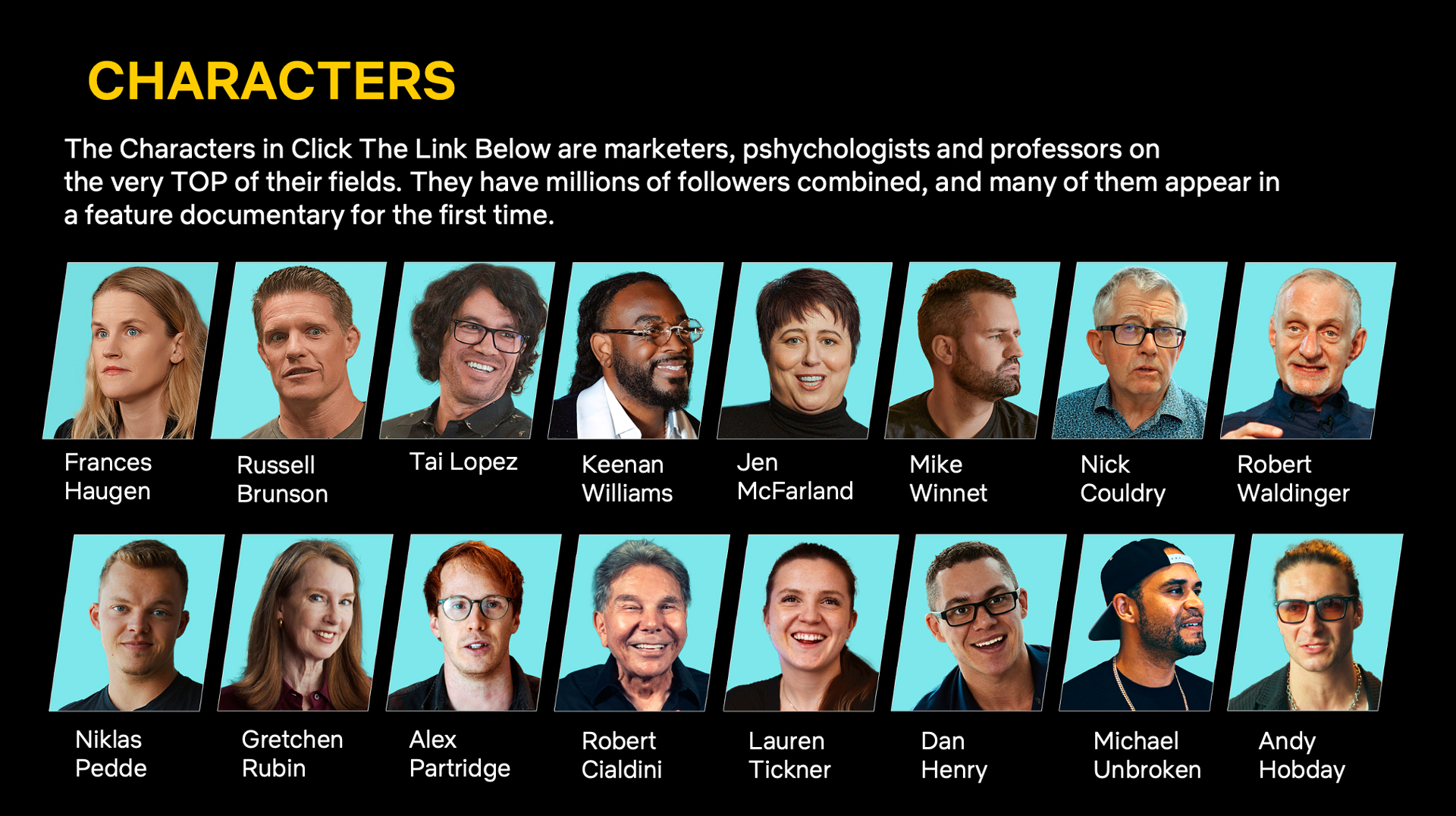 The Characters in Click The Link Below are marketers, pshychologists and professors on the very TOP of their fields. They have millions of followers combined, and many of them appear in a feature documentary for the first time.